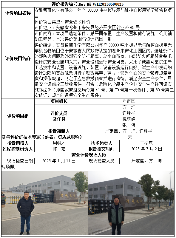 安徽智研化學(xué)有限公司年產(chǎn)30000噸平板顯示與觸控面板用光學(xué)聚合物項(xiàng)目安全驗(yàn)收評價