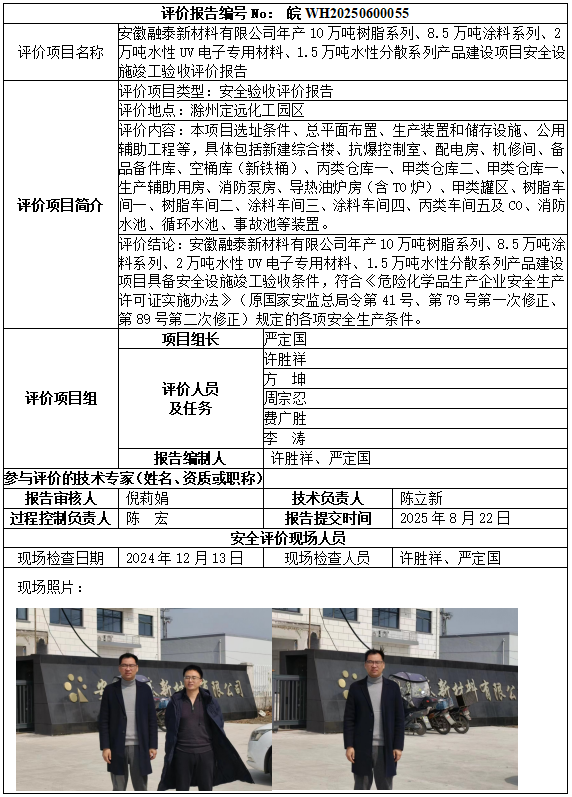 安徽融泰新材料有限公司年產(chǎn)10萬噸樹脂系列、8.5萬噸涂料系列、2萬噸水性UV電子專用材料、1.5萬噸水性分散系列產(chǎn)品建設(shè)項(xiàng)目安全設(shè)施竣工驗(yàn)收評價(jià)報(bào)告