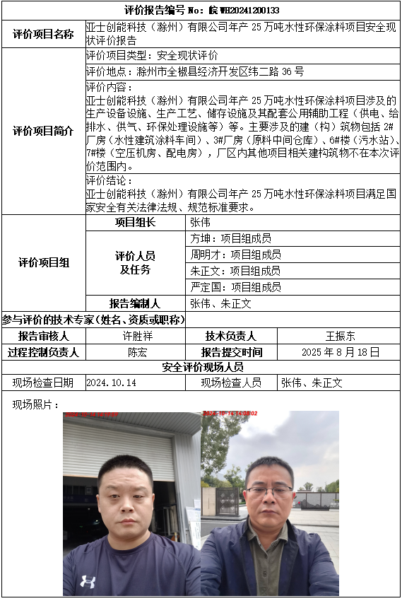 亞士創(chuàng)能科技(滁州)有限公司年產(chǎn)25萬噸水性環(huán)保涂料項(xiàng)目安全現(xiàn)狀評價(jià)報(bào)告