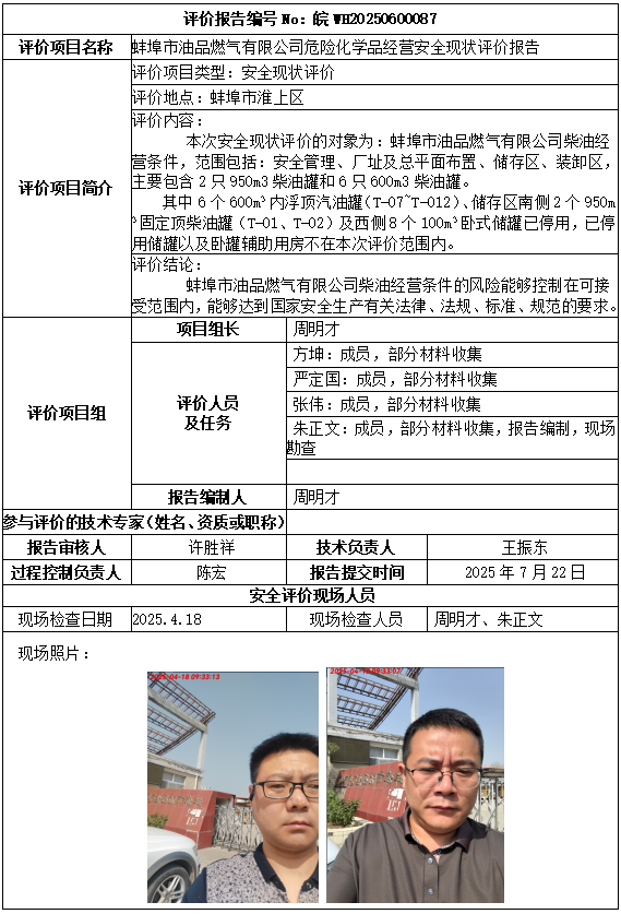 蚌埠市油品燃?xì)庥邢薰疚kU(xiǎn)化學(xué)品經(jīng)營安全現(xiàn)狀評(píng)價(jià)報(bào)告