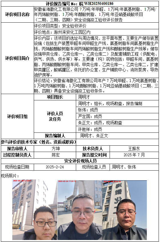 安徽省?;栈び邢薰?萬噸/年甲醛、1萬噸/年氨基樹脂、1萬噸/年丙烯酸樹脂、1萬噸/年醇酸樹脂、1萬噸/年亞硝基硫酸項(xiàng)目 (二期、三期、四期)安全設(shè)施竣工驗(yàn)收評價報(bào)告