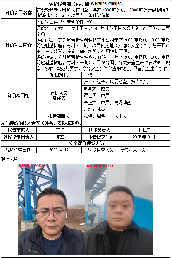 安徽聚芳新材料科技有限公司年產(chǎn)6000噸聚砜、2000噸聚芳醚醚腈樹(shù)脂新材料(一期)項(xiàng)目安全條件評(píng)價(jià)報(bào)告